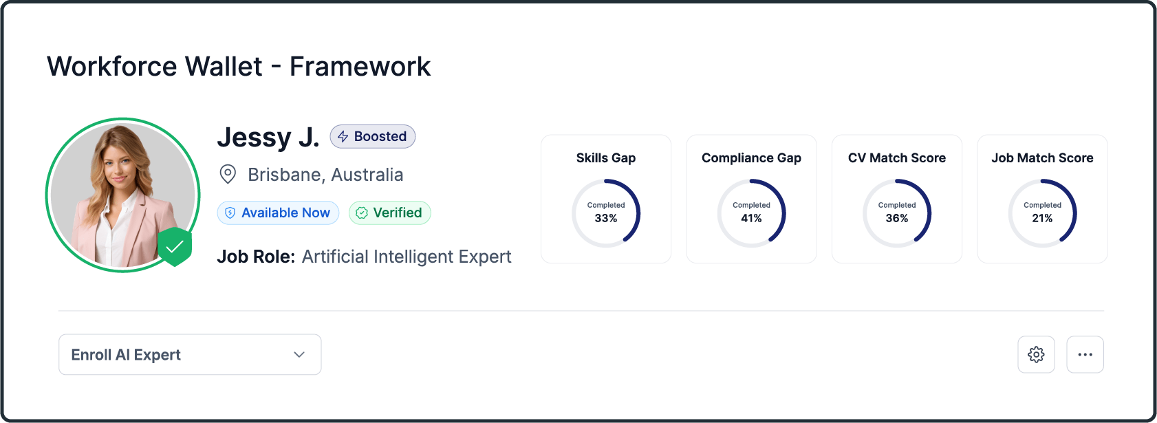 After you complete your onboarding, we publish your Workforce Wallet with dynamic reports on how your skills, qualifications and experience align to the job role requirements published by our employers.